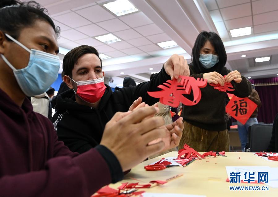 2月4日,外國(guó)留學(xué)生學(xué)剪“春”字窗花。
