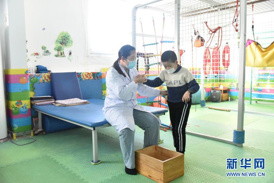 在哈爾濱博能中醫(yī)門診部,劉雨晴為腦癱兒童進(jìn)行康復(fù)訓(xùn)練(2月2日攝)。