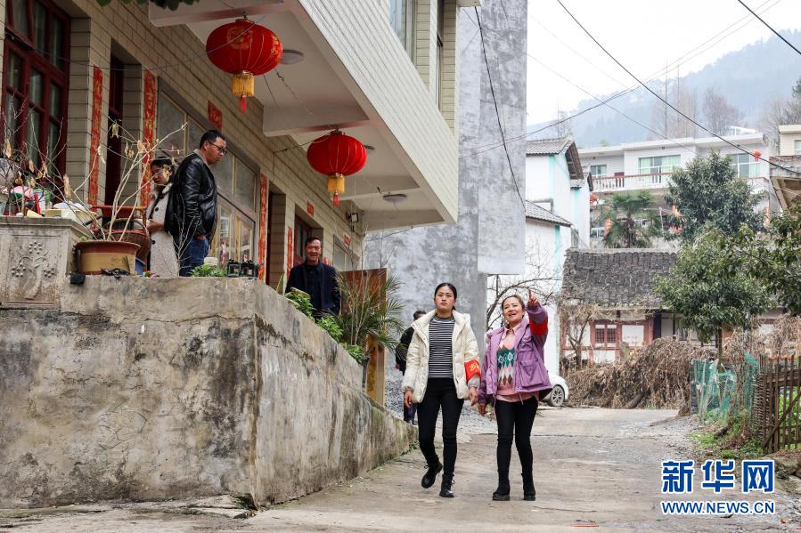 2月13日,吳窮(右一)和村干部吳洪梅在坪子社區(qū)走訪。新華社記者 歐東衢攝