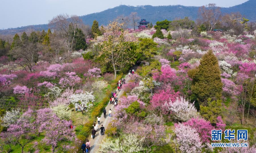 2月14日,游人在南京梅花山賞花(無(wú)人機(jī)照片)。新華社發(fā)(蘇陽(yáng) 攝)