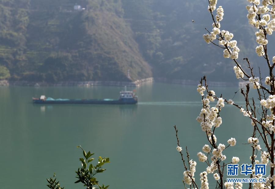 2月14日,長江湖北省秭歸縣江段岸邊山花開放。新華社發(fā)(王輝富 攝)