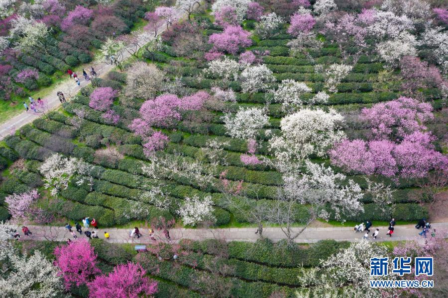 2月14日,游人在南京梅花山賞花(無人機照片)。新華社發(fā)(蘇陽 攝)