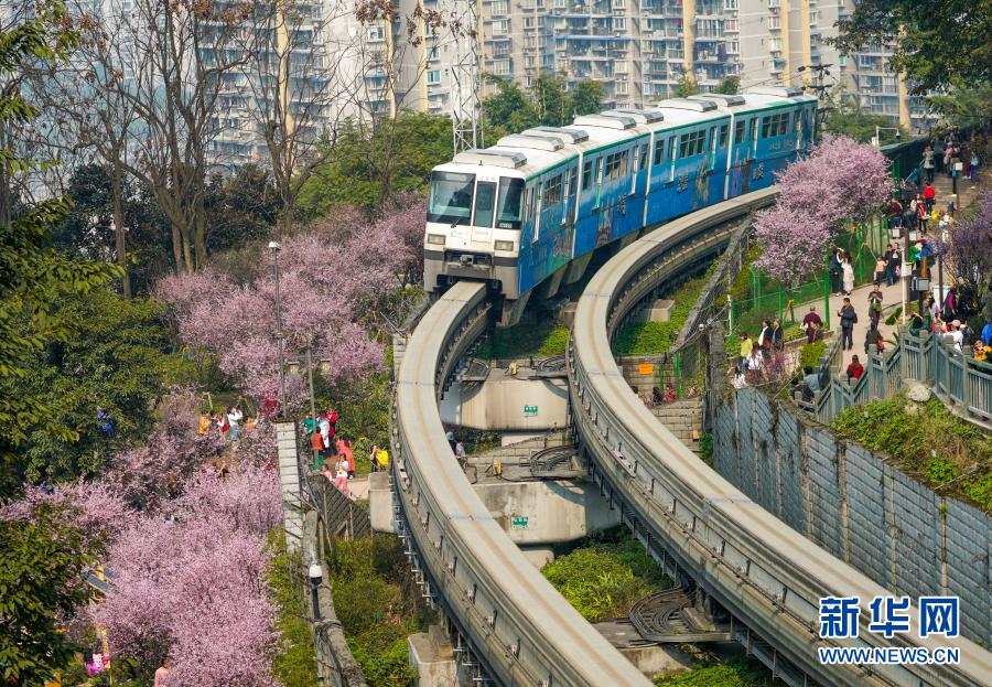 2月23日,在重慶軌道交通2號線佛圖關段,一列單軌列車穿越花海奔馳而過。