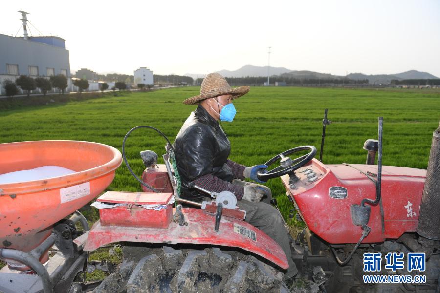 2月23日,湖州錢山下糧油專業(yè)合作社工作人員駕駛農(nóng)機(jī)前往田間給小麥?zhǔn)┓省A⒋哼^后氣溫回升,浙江省湖州市吳興區(qū)道場鄉(xiāng)全力開展春耕工作。今年該鄉(xiāng)計劃播種農(nóng)作物總面積1.2萬畝,其中水稻5000畝、小麥2000畝。新華社記者 翁忻旸 攝