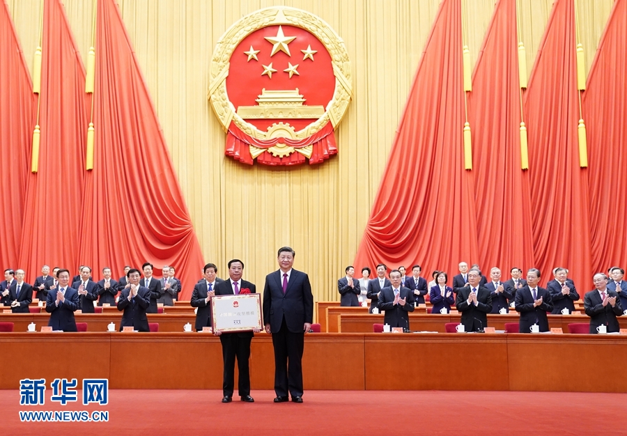 2月25日,全國(guó)脫貧攻堅(jiān)總結(jié)表彰大會(huì)在北京人民大會(huì)堂隆重舉行。這是習(xí)近平為全國(guó)脫貧攻堅(jiān)楷模榮譽(yù)稱號(hào)獲得者陜西省綏德縣張家砭鎮(zhèn)郝家橋村頒獎(jiǎng)。新華社記者 燕雁 攝