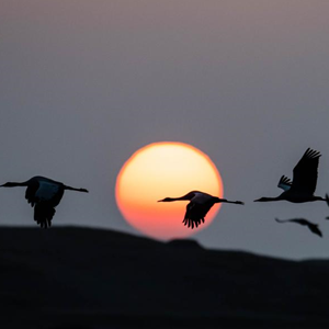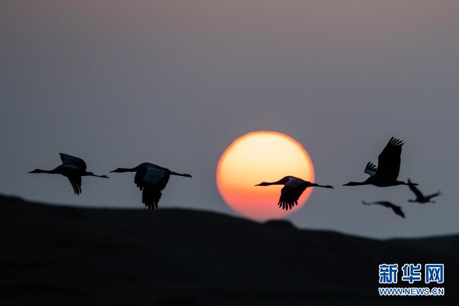 日出時(shí)分,黑頸鶴在大山包黑頸鶴國家級自然保護(hù)區(qū)飛翔(2月27日攝)。