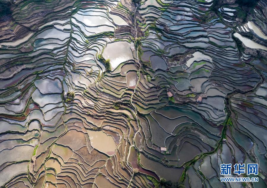 春日里,位于云南省紅河哈尼族彝族自治州元陽縣境內(nèi)的哈尼梯田在不同光照條件下呈現(xiàn)出豐富色彩,與周邊村寨、山系等和諧相融,猶如一幅幅色彩斑斕的油畫,美不勝收。