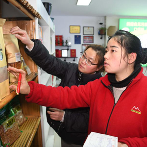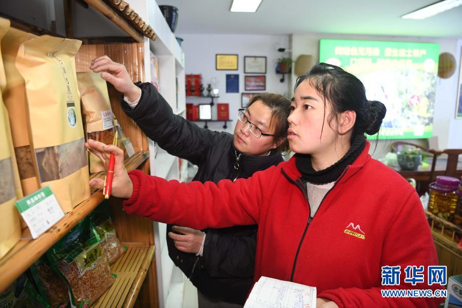 張志菊(前)在自己的土特產店里清點商品(2月26日攝)。