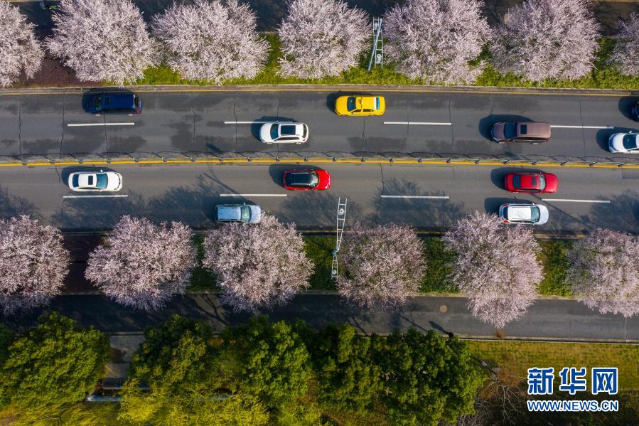 3月2日,汽車行駛在鮮花盛開的江蘇省昆山市馬鞍山路上(無(wú)人機(jī)照片)。春回大地,各地繁花盛開,春意盎然、生機(jī)勃勃。
