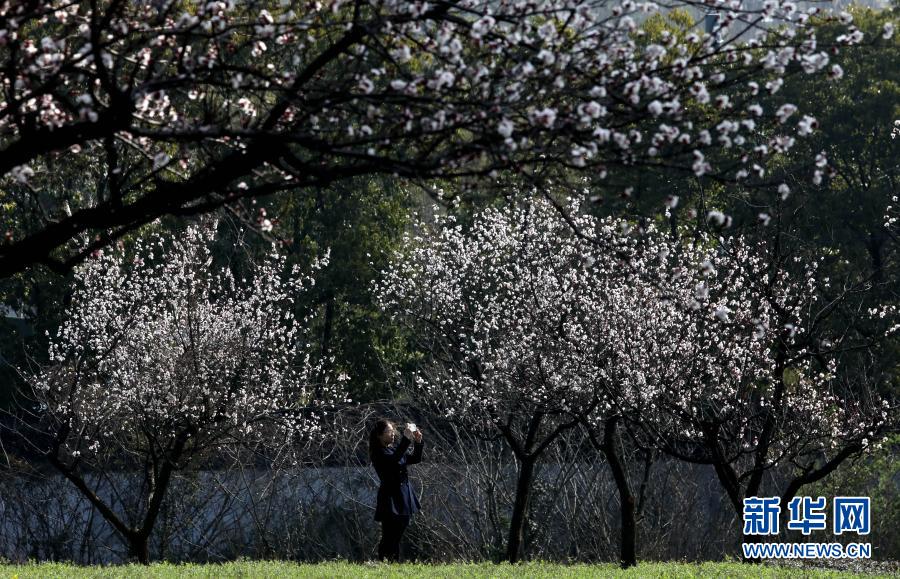 3月2日,游客在蘇州上方山國家森林公園內(nèi)觀賞杏花。新華社發(fā)(杭興微 攝)