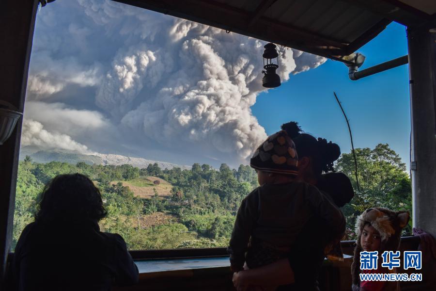 3月2日,人們?cè)谟《饶嵛鱽啽碧K門答臘省卡羅觀看噴發(fā)的錫納朋火山。新華社發(fā)(森比林?jǐn)z)