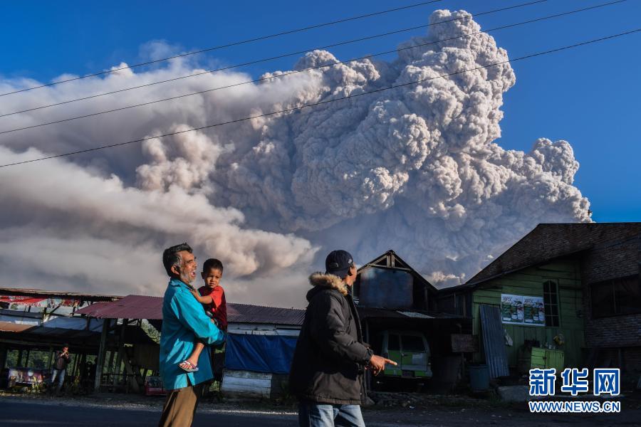3月2日,人們?cè)谟《饶嵛鱽啽碧K門(mén)答臘省卡羅觀看噴發(fā)的錫納朋火山。新華社發(fā)(森比林?jǐn)z)