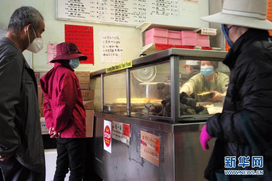 3月3日,人們?cè)诿绹?guó)加利福尼亞州舊金山唐人街一家餐館內(nèi)購買餐食。新華社記者 吳曉凌 攝