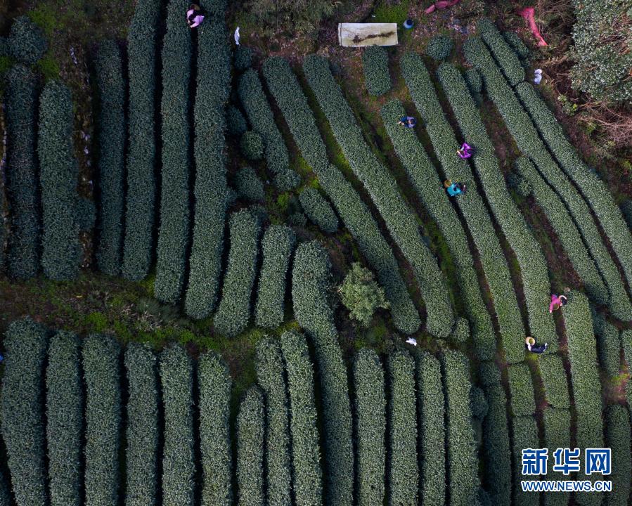 3月12日,在位于杭州市西湖風(fēng)景名勝區(qū)滿覺隴村白鶴峰的西湖龍井茶葉基地,茶農(nóng)在采摘西湖龍井頭茶(無人機照片)。