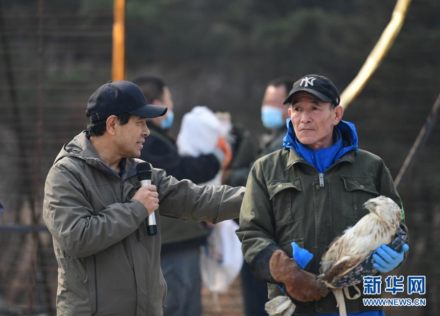 3月14日,沈陽猛禽救助中心王唯彥(左)介紹放飛猛禽救助情況。