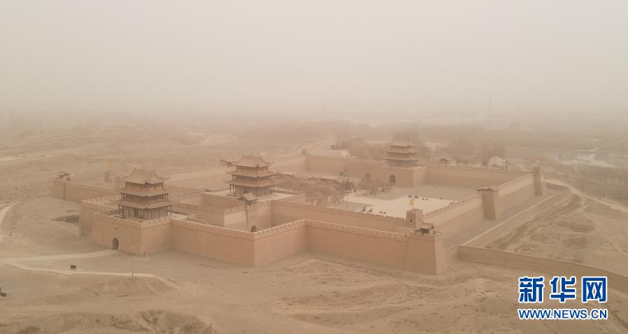當日,甘肅河西走廊部分地區(qū)出現(xiàn)浮塵天氣,嘉峪關關城被浮塵籠罩。