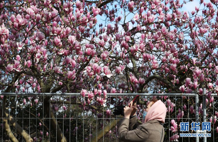 3月19日,在法國巴黎埃菲爾鐵塔腳下的戰(zhàn)神廣場(chǎng),一名女子拍攝玉蘭花。新華社記者高靜攝