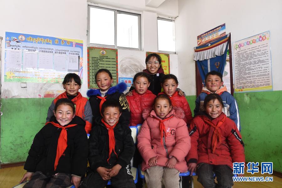 3月16日,在索加鄉(xiāng)寄宿小學(xué),達哇才吉老師(后排中)和學(xué)生在一起。新華社記者 韓方方 攝
