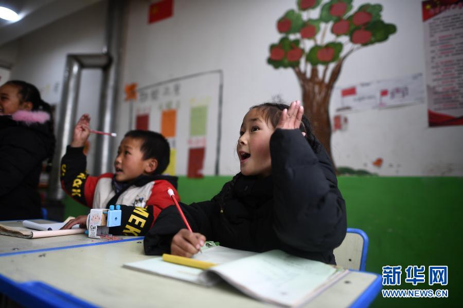 3月16日,索加鄉(xiāng)寄宿小學(xué)學(xué)生白瑪措毛(右)在藏語(yǔ)文課上舉手回答問(wèn)題。新華社記者 張宏祥 攝
