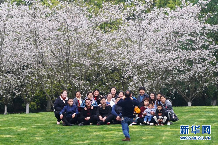 3月20日,游人在櫻花樹(shù)前拍照留念。