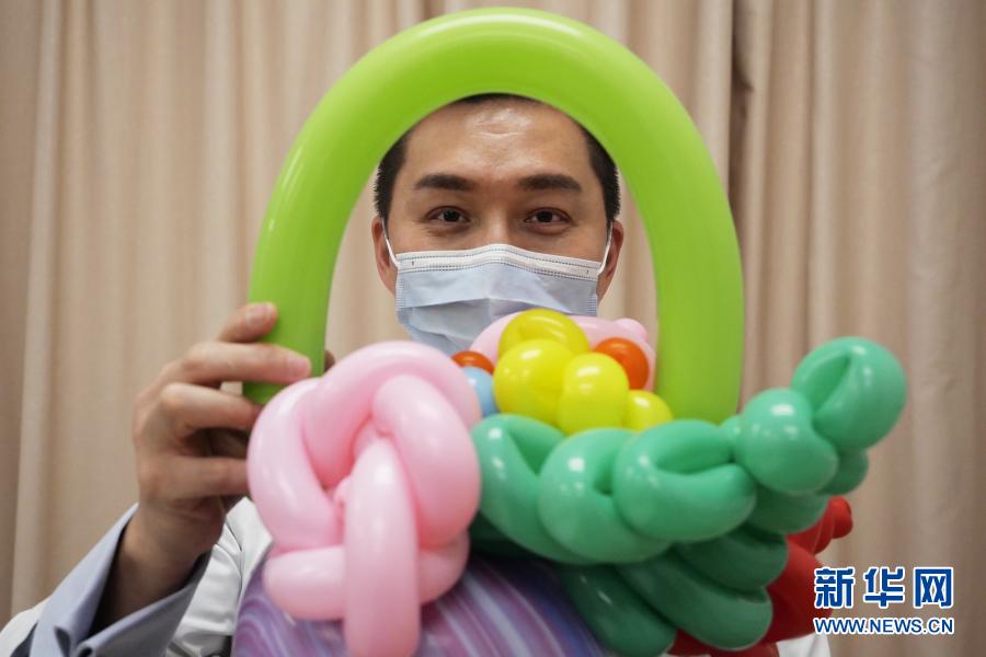 在香港東區(qū)醫(yī)院,“氣球大夫”陳諾文醫(yī)生展示他制作的氣球花籃(3月16日攝)。