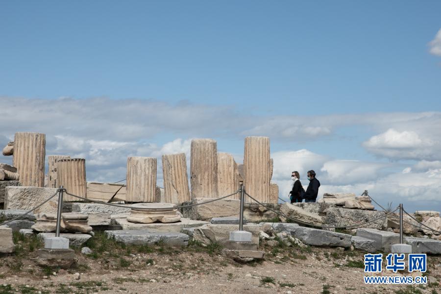 3月22日,游客游覽希臘雅典衛(wèi)城。希臘露天考古遺跡22日起恢復(fù)開放。游客需遵守保持社交距離和佩戴口罩等防疫規(guī)定。新華社發(fā)(萊夫特里斯·帕察里斯攝)