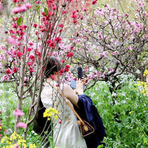 3月26日,“春暖浦東 十里桃花”2021上海桃花節(jié)開(kāi)幕儀式在浦東南匯惠南鎮(zhèn)桃花村舉行,兩名當(dāng)?shù)仄炫蹍f(xié)會(huì)的姑娘在桃花村賞花。