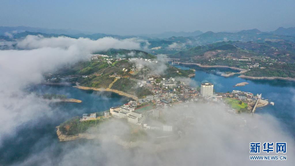 3月28日拍攝的云霧中的流水鎮(zhèn)(無人機(jī)照片)。