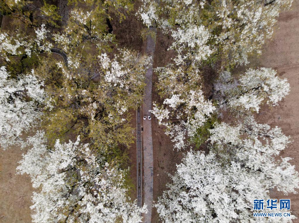 4月3日,游客在中衛(wèi)市南長灘村觀賞盛開的梨花(無人機(jī)照片)。