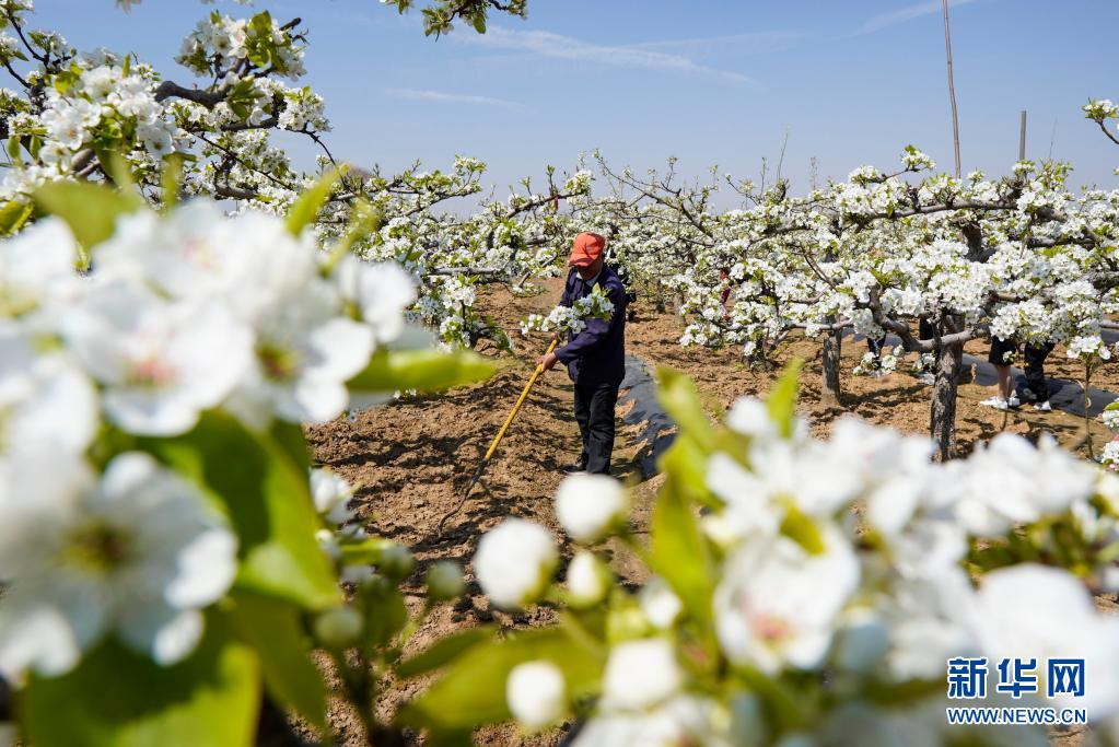 4月5日,在江蘇省連云港市贛榆區(qū)贛馬鎮(zhèn)黑坡村黃金梨基地內(nèi),果農(nóng)給梨樹松土。