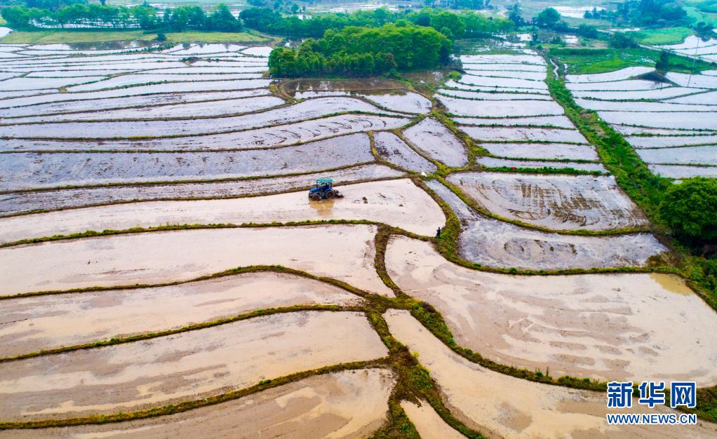 4月6日,江西省新余市仙女湖區(qū)鈐陽辦事處白田村農(nóng)民駕駛農(nóng)機耙田、施肥,為早稻插秧作準備(無人機拍攝)。