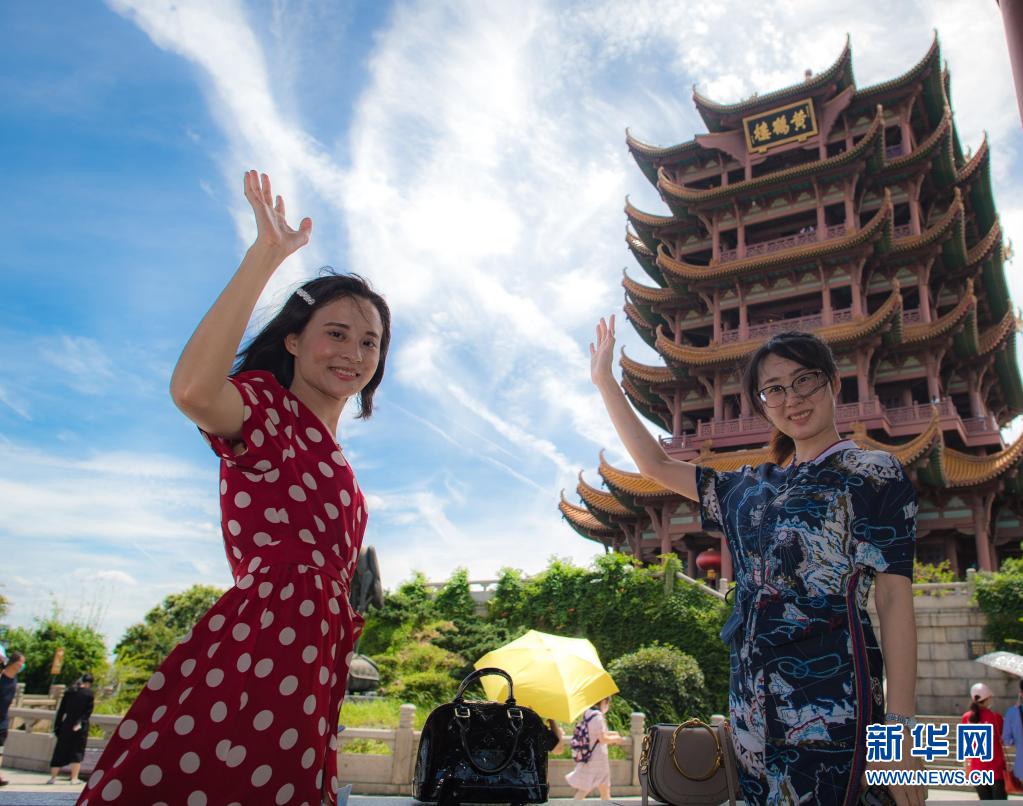2020年8月7日,受邀來湖北旅游的海南援鄂醫(yī)療隊員陳小妹(左)與同事計超在黃鶴樓景區(qū)觀光。湖北省組織“與愛同行 惠游湖北”活動,陸續(xù)邀請援鄂醫(yī)護人員代表以及湖北醫(yī)護人員、社區(qū)工作者、志愿者等走進景區(qū),飽覽荊楚風(fēng)貌。新華社記者 肖藝九 攝