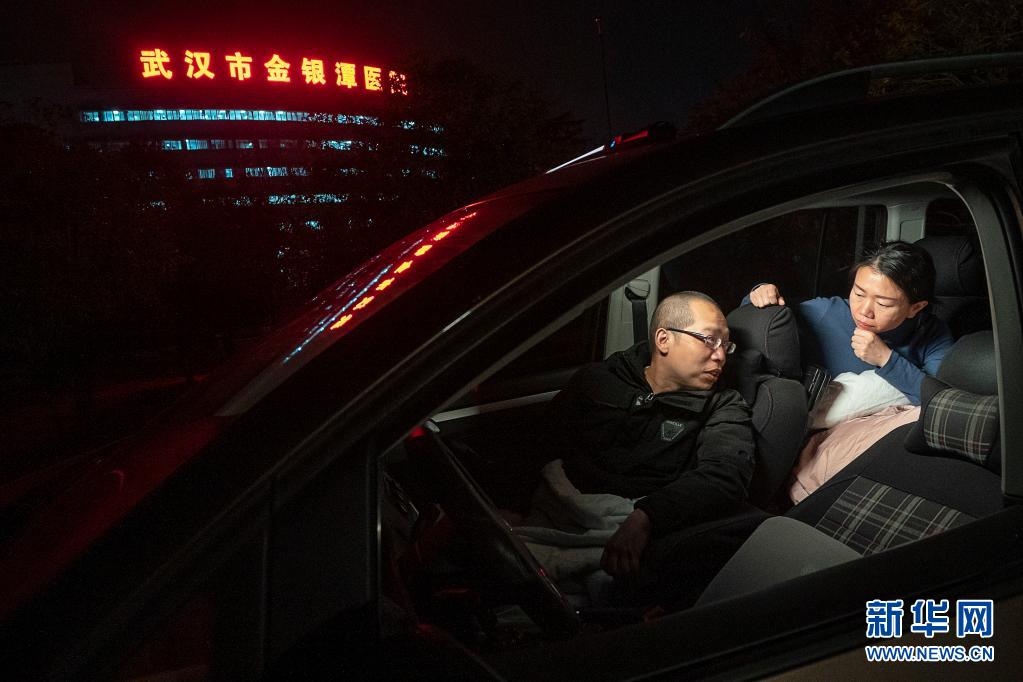 2020年2月22日晚,武漢市金銀潭醫(yī)院的醫(yī)護夫妻涂盛錦(左)與曹珊在車內(nèi)聊天。從大年初一開始,兩人就住進車?yán)铮瑸樵谝咔橹袚尵炔』?,爭分奪秒,以車為家。新華社記者 熊琦 攝