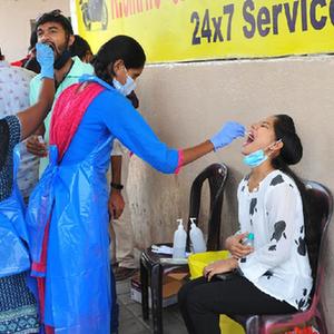 4月11日,人們在印度班加羅爾的一個(gè)公交站接受新冠病毒檢測取樣。