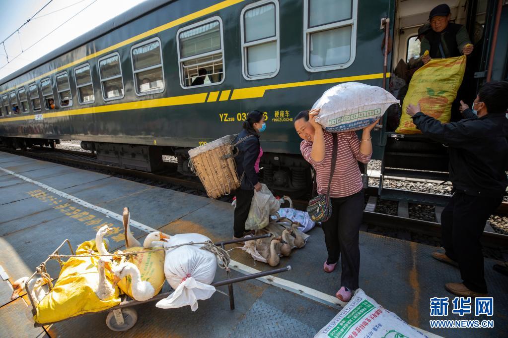 5633次列車??寇囌竞?,彝族小商販忙著把貨卸下來(lái)(4月11日攝)。新華社記者 沈伯韓 攝