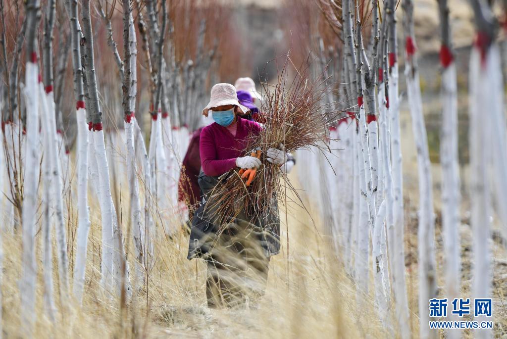 在青海省玉樹藏族自治州高原千畝林木良種繁育實(shí)驗(yàn)基地,當(dāng)?shù)厝罕娫谇謇硇藜暨^的樹枝(2020年3月29日攝)。