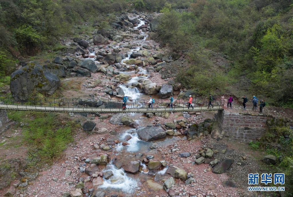 4月18日,徒步愛好者沿著大相嶺茶馬古道,通過一座吊橋。新華社記者 江宏景 攝