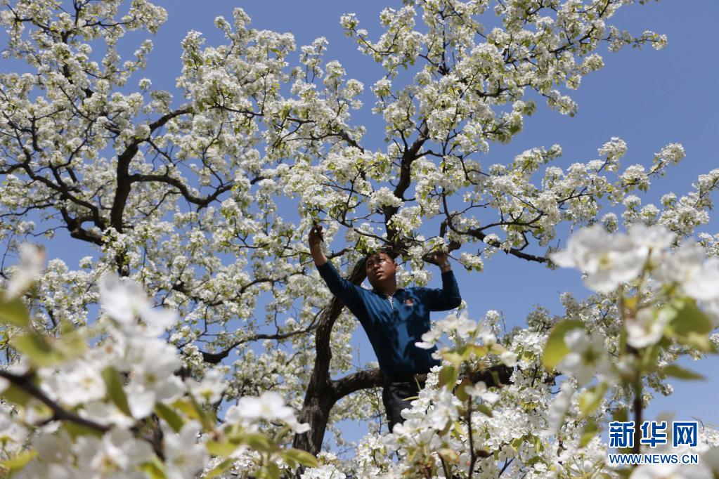 4月19日,農(nóng)民在河北省承德縣新杖子鎮(zhèn)葦子峪村梨園為梨樹(shù)疏花。