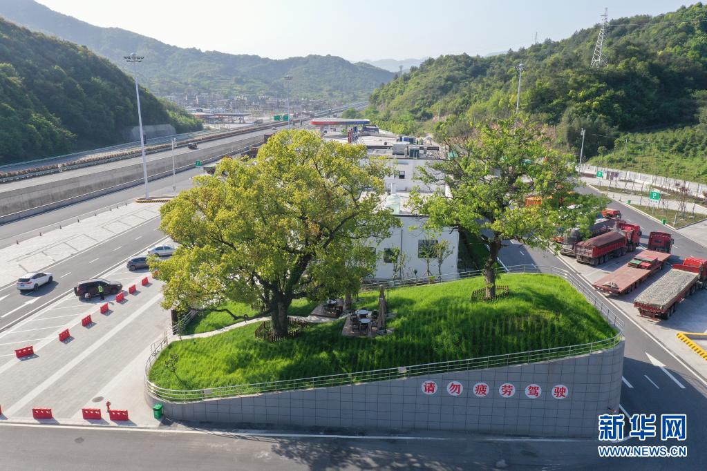 杭州第二繞城高速西復(fù)線次塢服務(wù)區(qū)有3棵樹齡在100年以上的古樹。服務(wù)區(qū)在建設(shè)過程中,將古樹保護起來,現(xiàn)已成為一道特色景觀。新華社發(fā)(郭斌 攝)