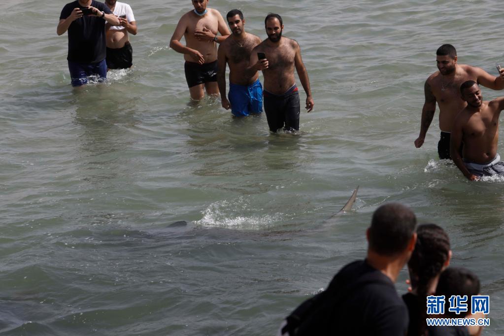 4月20日,在以色列北部城市哈代拉的海邊,鯊魚從人們身邊游過(guò)。