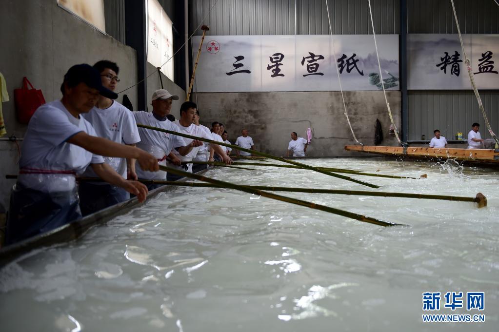近日,在宣紙產(chǎn)地安徽省宣城市涇縣,“四丈宣紙”的抄制在一家紙業(yè)有限公司啟動。50余名撈紙師傅操作巨型紙簾,齊心協(xié)力,在紙槽旁進(jìn)行撈紙作業(yè)。來回起落兩次,動作整齊劃一。隨后工人們將紙簾吊起放至一邊揭下,一張巨大的宣紙便撈制成功。經(jīng)過曬、剪等工序后, 制成長13.2米、寬3.6米的巨型宣紙就是“四丈宣紙”。
