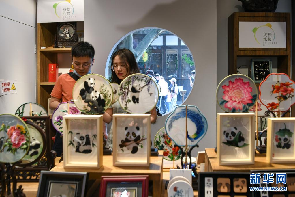 5月1日,游客在四川省成都市寬窄巷子景區(qū)的一家商店選購蜀繡產(chǎn)品。