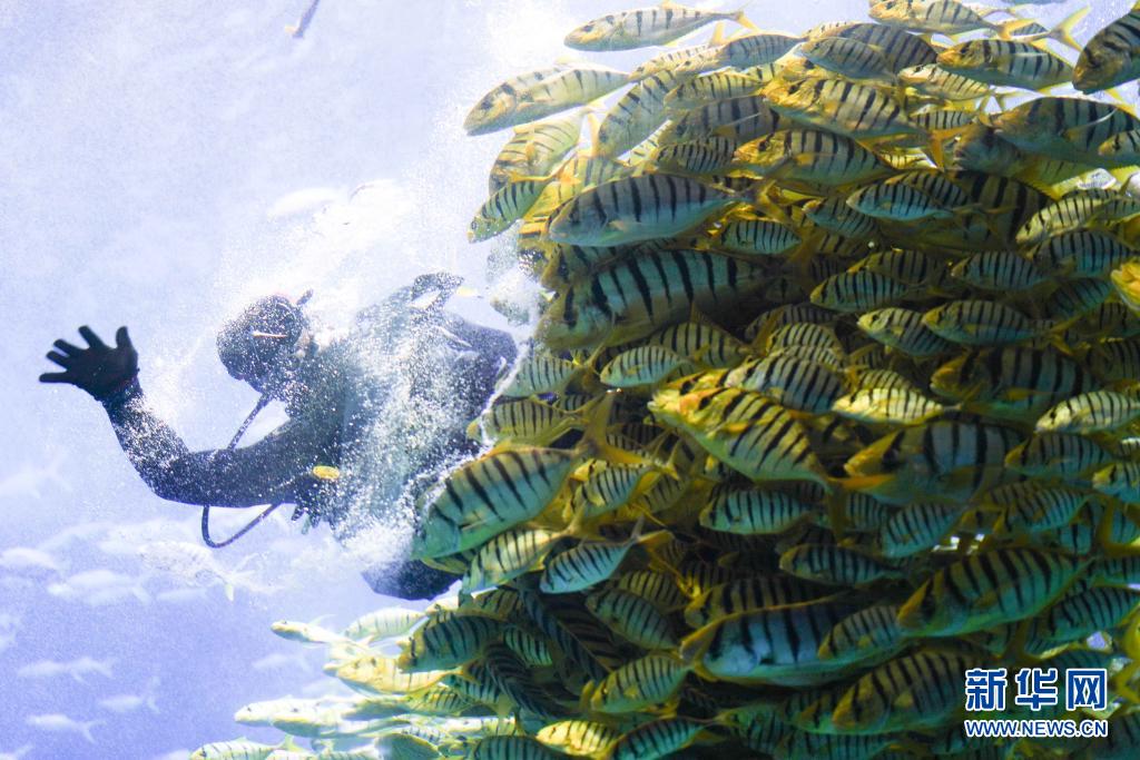 5月1日,在哈爾濱市的波塞冬旅游度假區(qū)海底世界觀賞區(qū),演職人員在進行魚類喂食表演。
