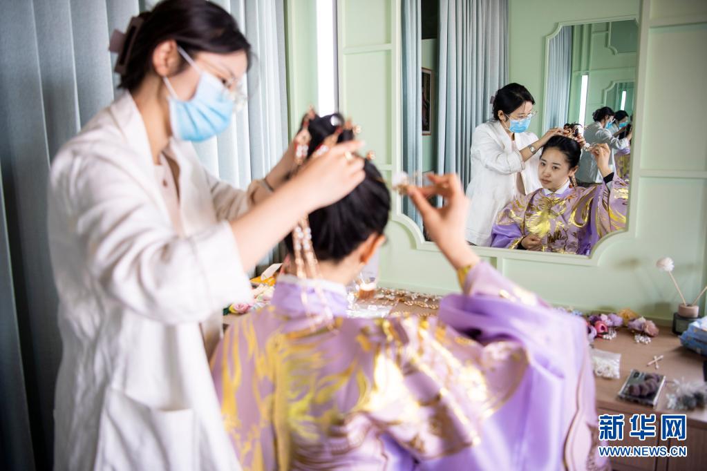 5月4日,在太原古縣城的一家店鋪內(nèi),游客化妝準(zhǔn)備體驗(yàn)古風(fēng)拍攝。