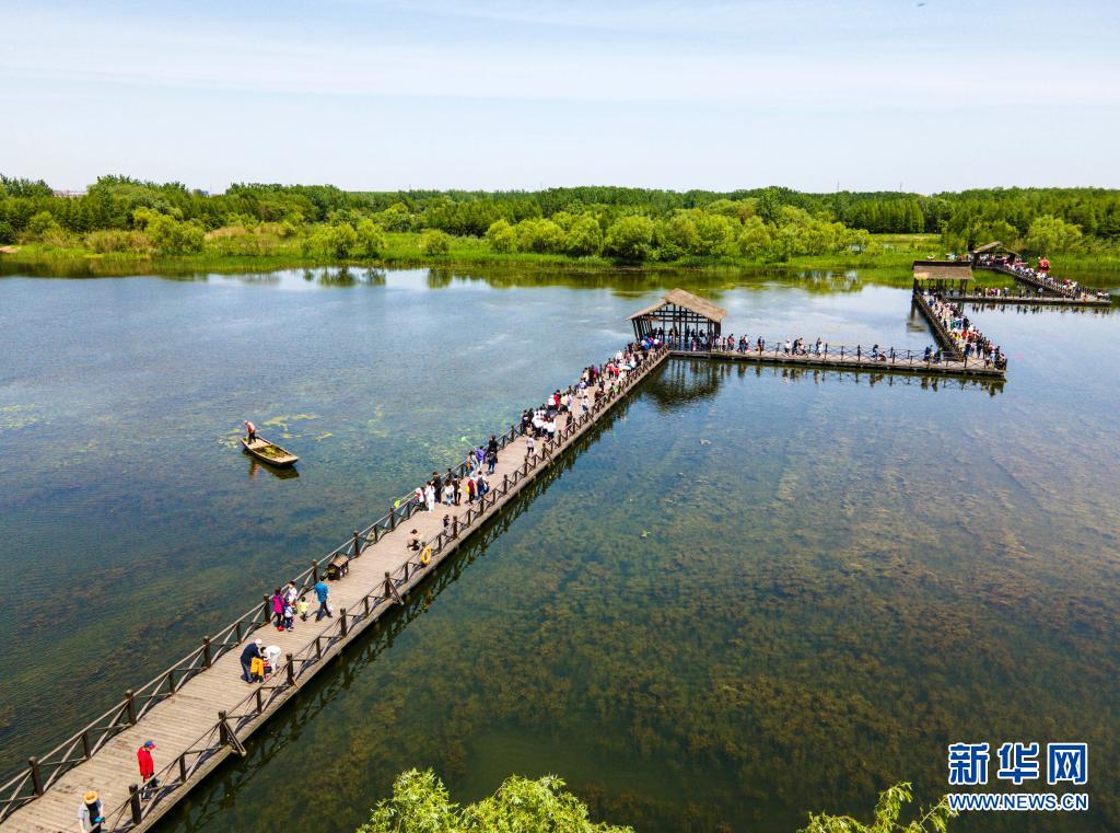 5月2日,游客在江蘇省泰州市姜堰區(qū)溱湖國(guó)家濕地公園棧道上游覽(無(wú)人機(jī)照片)。新華社發(fā)(顧繼紅 攝)