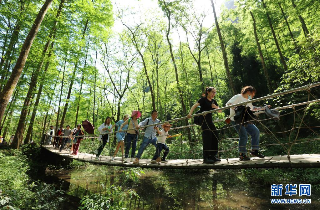 5月1日,游人在湖南省張家界市武陵源區(qū)金鞭溪景區(qū)游玩。新華社發(fā)(吳勇兵 攝)