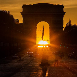 這是5月8日在法國(guó)巴黎香榭麗舍大街拍攝的凱旋門落日景象。