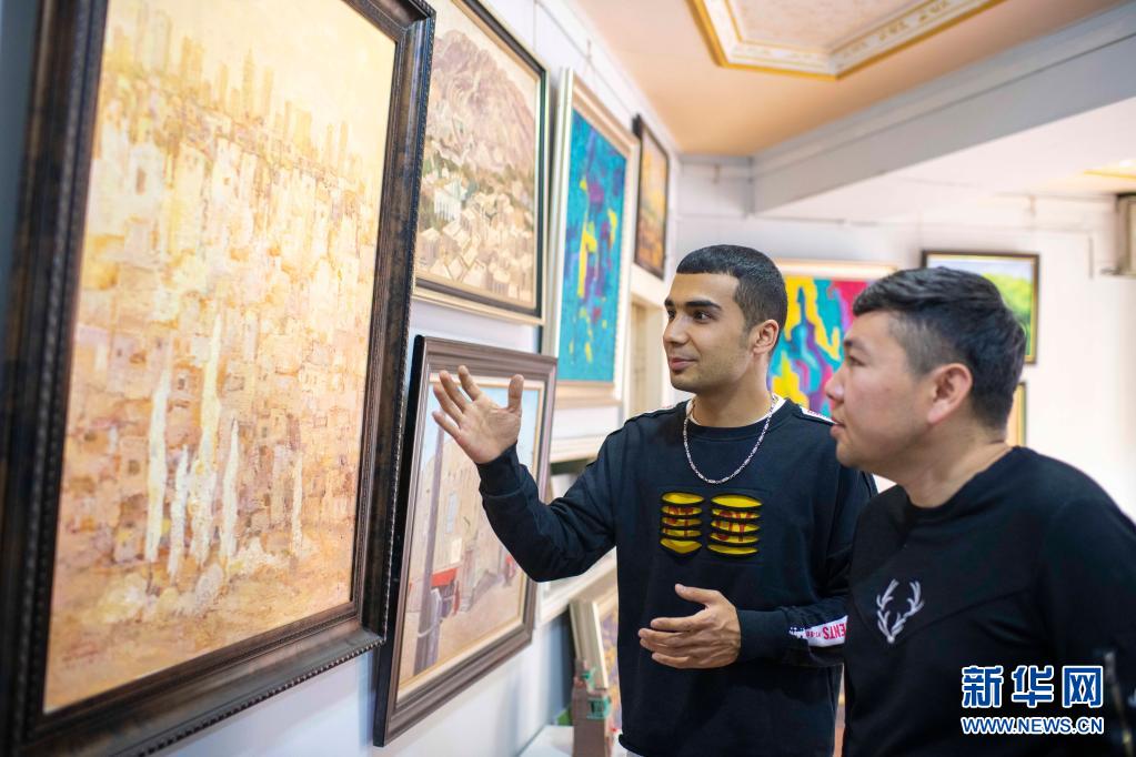 麥麥提吐爾遜江·麥麥提依明(左)在工作室內(nèi)向朋友介紹他創(chuàng)作的關(guān)于喀什的畫作《走進新時代》(5月5日攝)。新華社記者 胡虎虎 攝