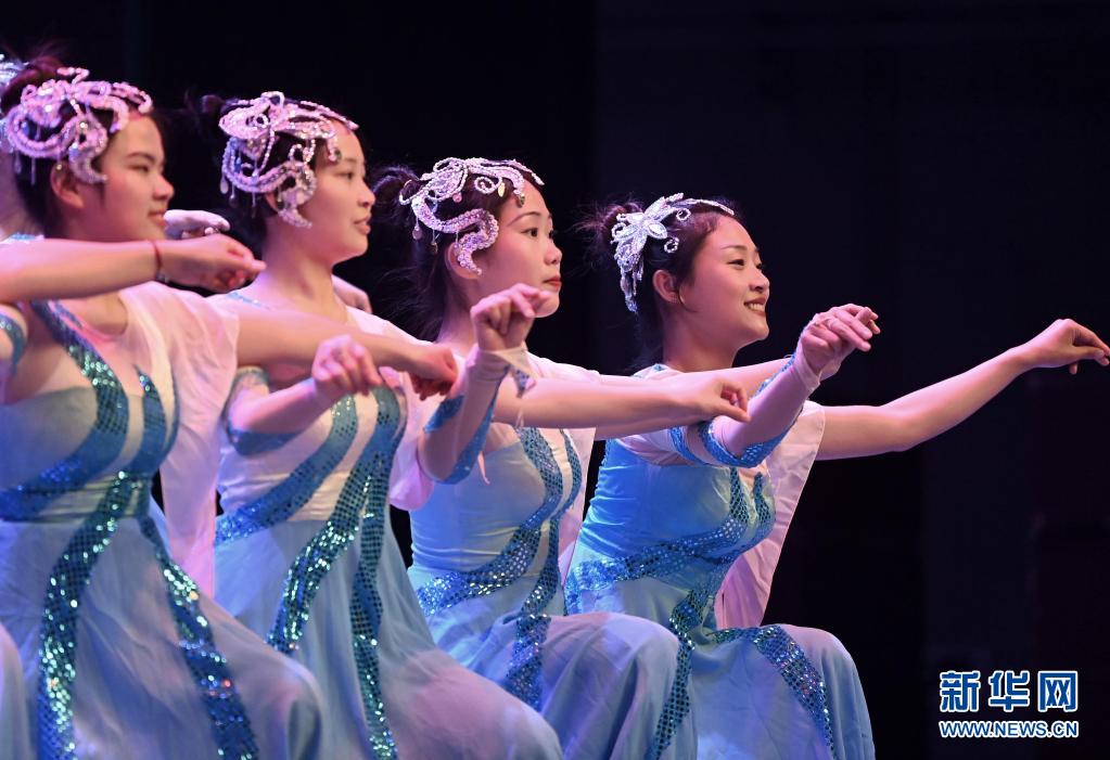 天津理工大學(xué)聾人工學(xué)院的舞蹈隊(duì)員們在學(xué)校的劇場里彩排(5月10日攝)。新華社記者 李然 攝