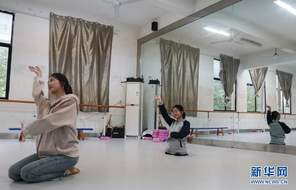 2021年5月11日,蔣張子怡(右)和同學(xué)在舞蹈房?jī)?nèi)練習(xí)舞蹈。